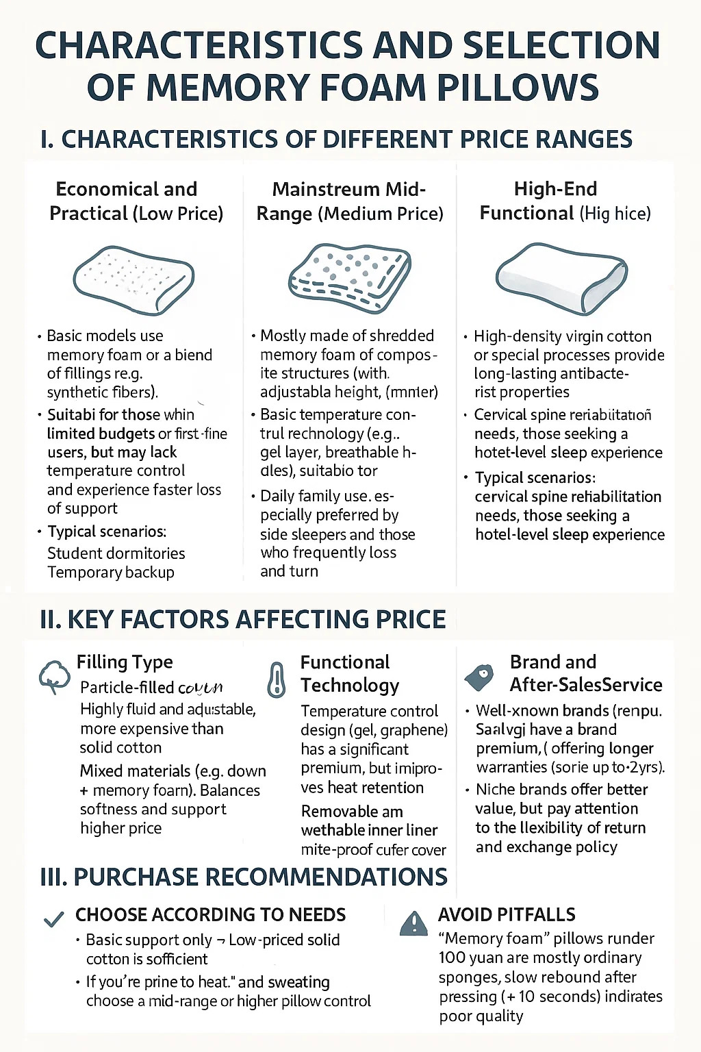 • Ang "Memory Foam" na mga unan sa ilalim ng 100 yuan ay karamihan sa mga ordinaryong sponges; Ang mabagal na rebound pagkatapos ng pagpindot (> 10 segundo) ay nagpapahiwatig ng hindi magandang kalidad.
