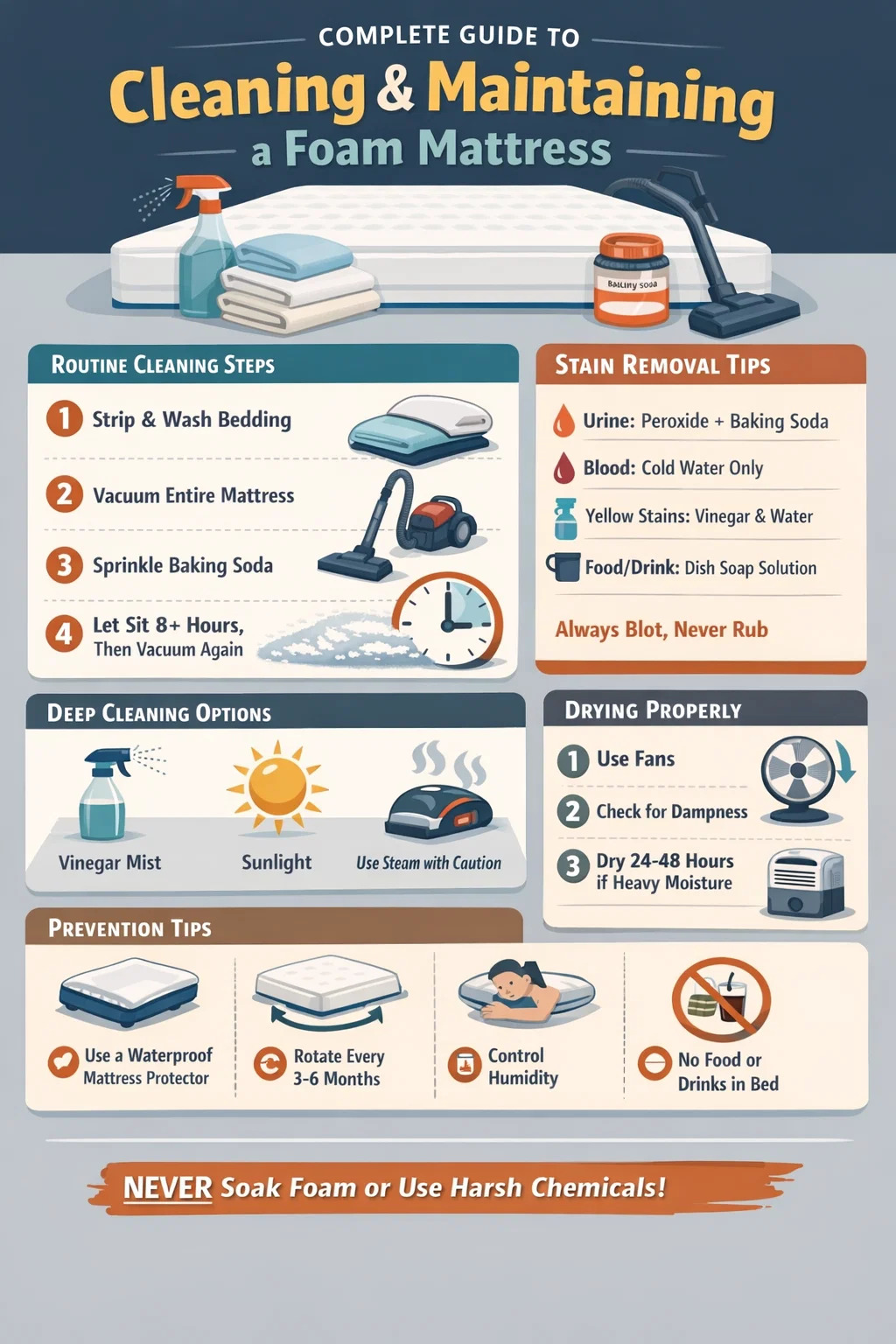 Gumagana ang pangunahing prosesong iyon para sa regular na pagpapanatili. Ngunit ang mga foam mattress - lalo na ang memory foam mattress - ay may mga natatanging katangian na nangangailangan ng mga partikular na diskarte depende sa uri ng gulo, edad ng mantsa, at kung gaano kadalas ka maglinis. Nasa ibaba ang isang masusing breakdown ng lahat ng kailangan mong malaman.