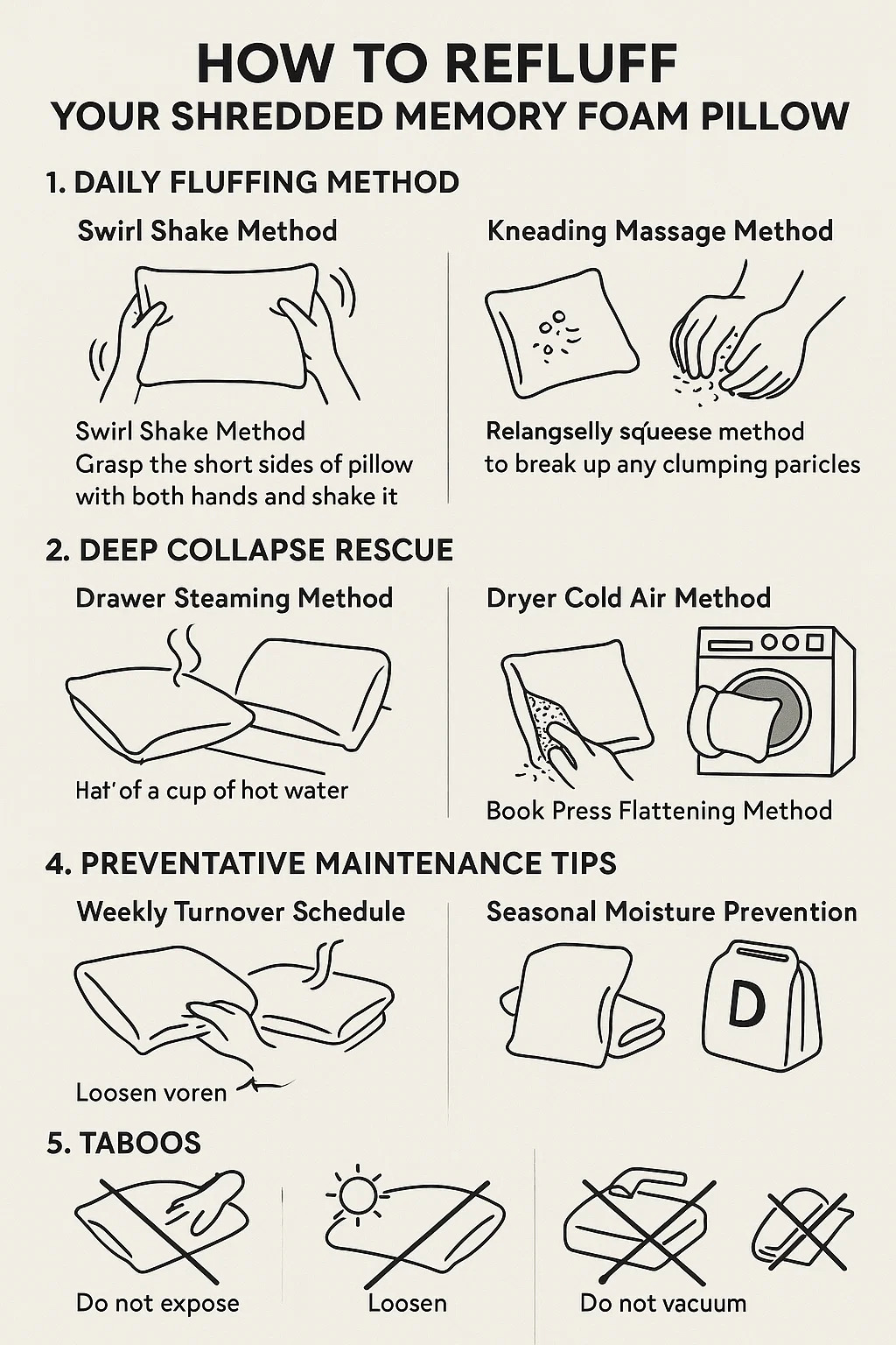 Narito ang mga hakbang-hakbang na tagubilin para sa pagmuni-muni ng iyong shredded memory foam unan :