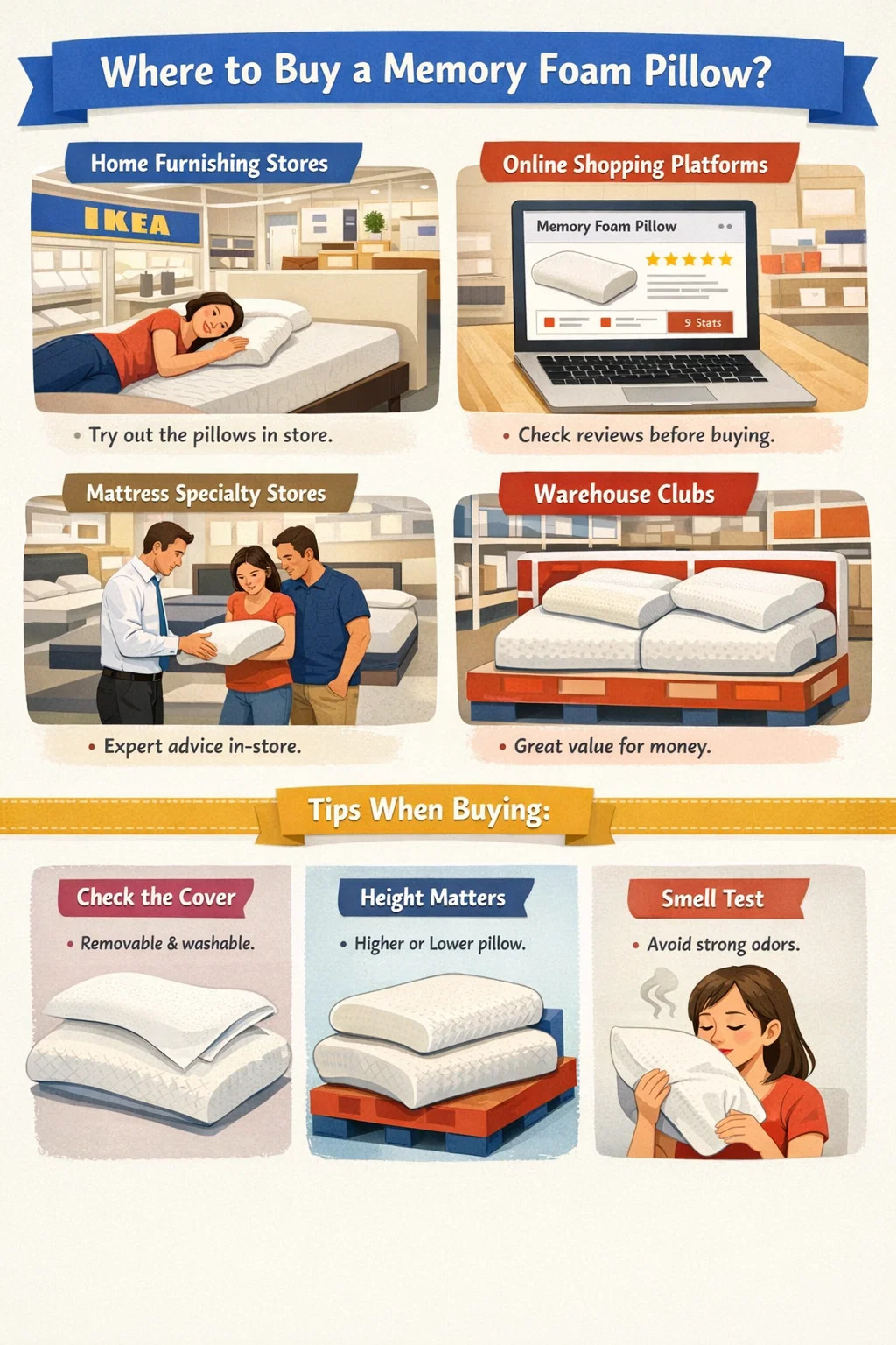 Ang mga lugar tulad ng IKEA o mga espesyal na tindahan ng muwebles sa bahay ang unang pagpipilian para sa maraming tao kapag pumipili ng memory foam pillow.